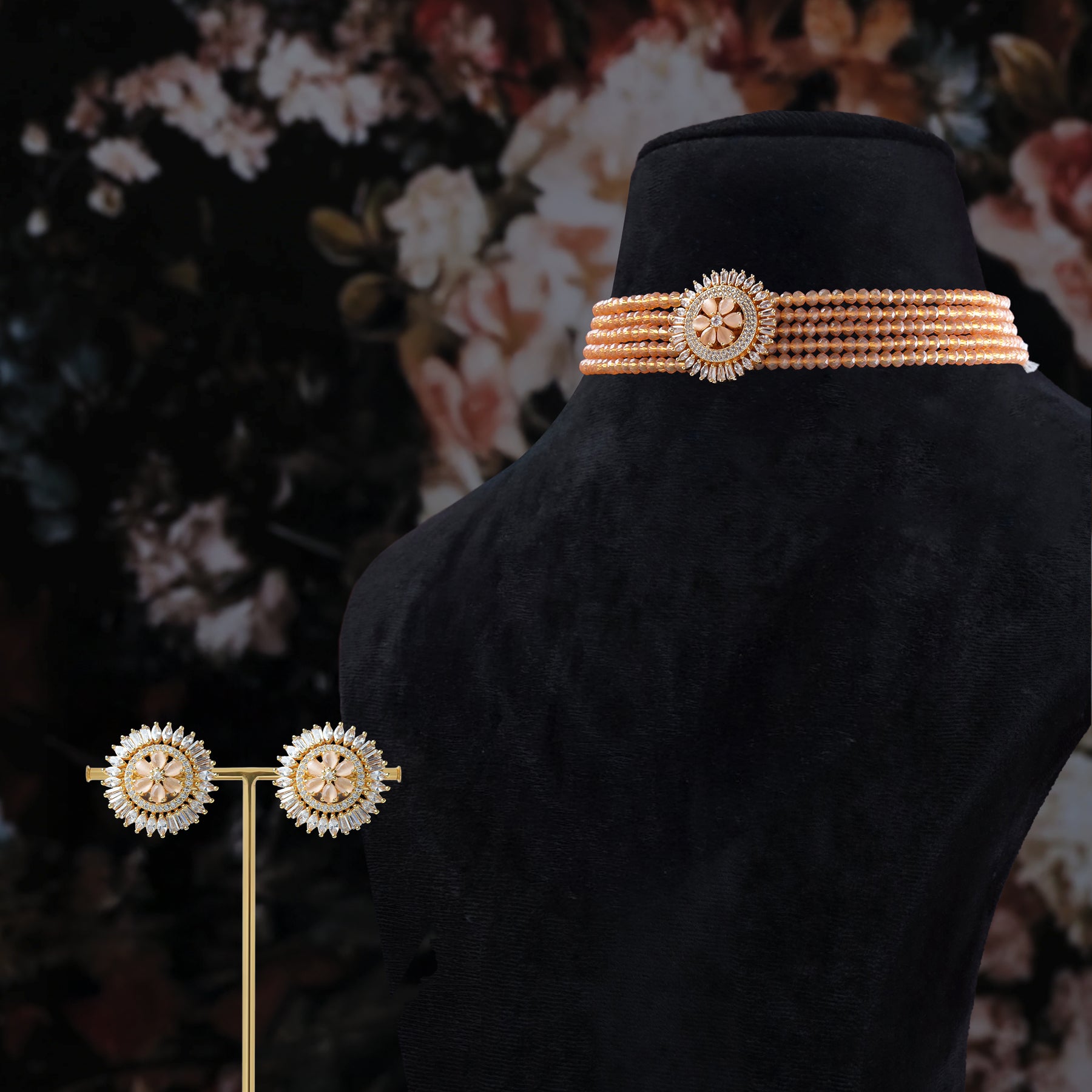 The Aarohi Chandrika Necklace Set is designed to dazzle with elegance and versatility. Its peach-toned bead strands, paired with a radiant gold-plated finish, make it a standout piece for festive occasions. The floral sunburst centerpiece adds a heritage-inspired charm, while the matching bold studs ensure a coordinated look. Lightweight and comfortable, it’s an ideal pick for brides, party wear, and family celebrations.