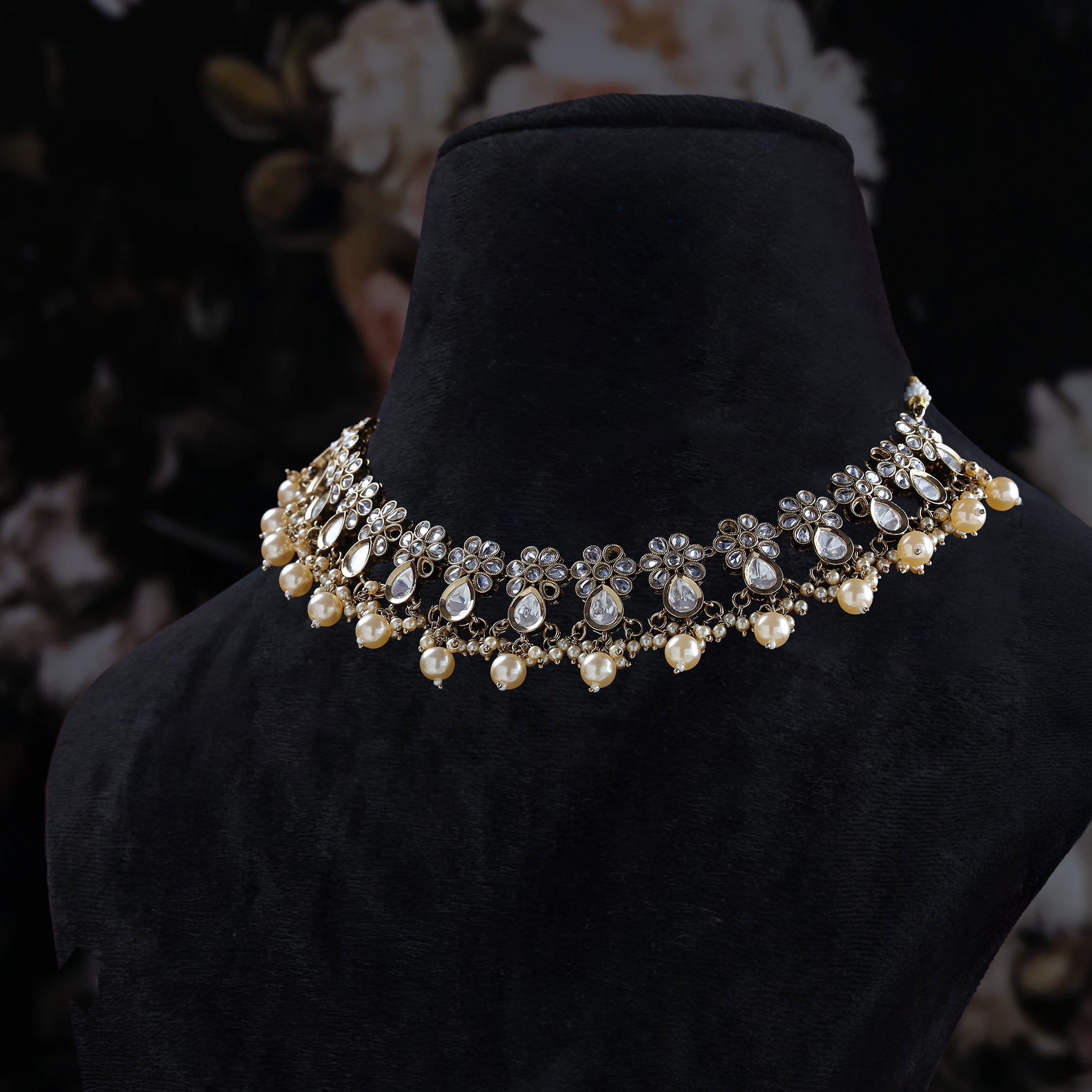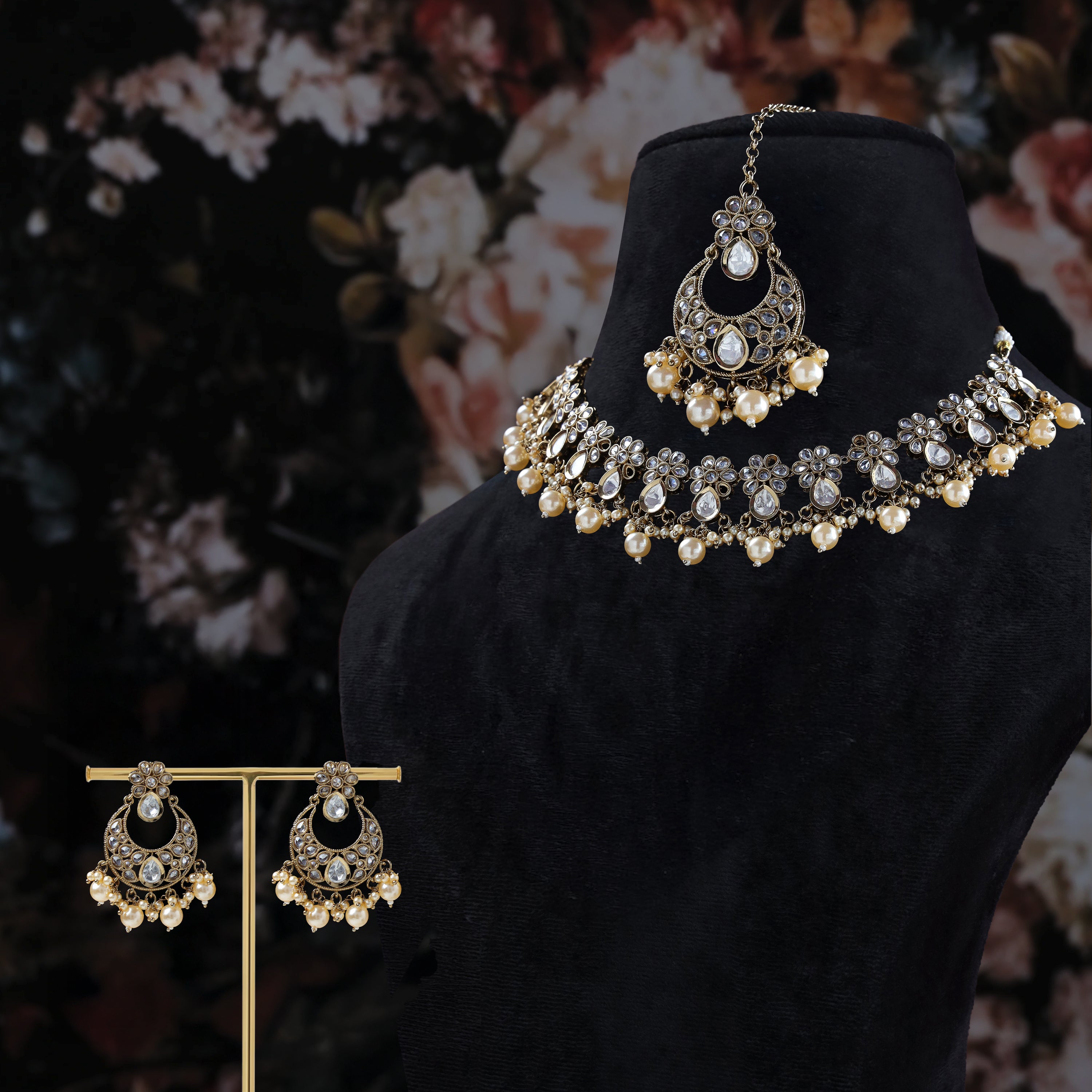 Celebrate every occasion with the Aarvi Necklace Kundan Set – a symbol of regal beauty. Featuring intricate kundan detailing, dazzling stones, and pearl drops, this set is designed to complete your festive look. The elegant choker necklace is complemented with matching earrings and a statement maang tikka for a perfect bridal ensemble.