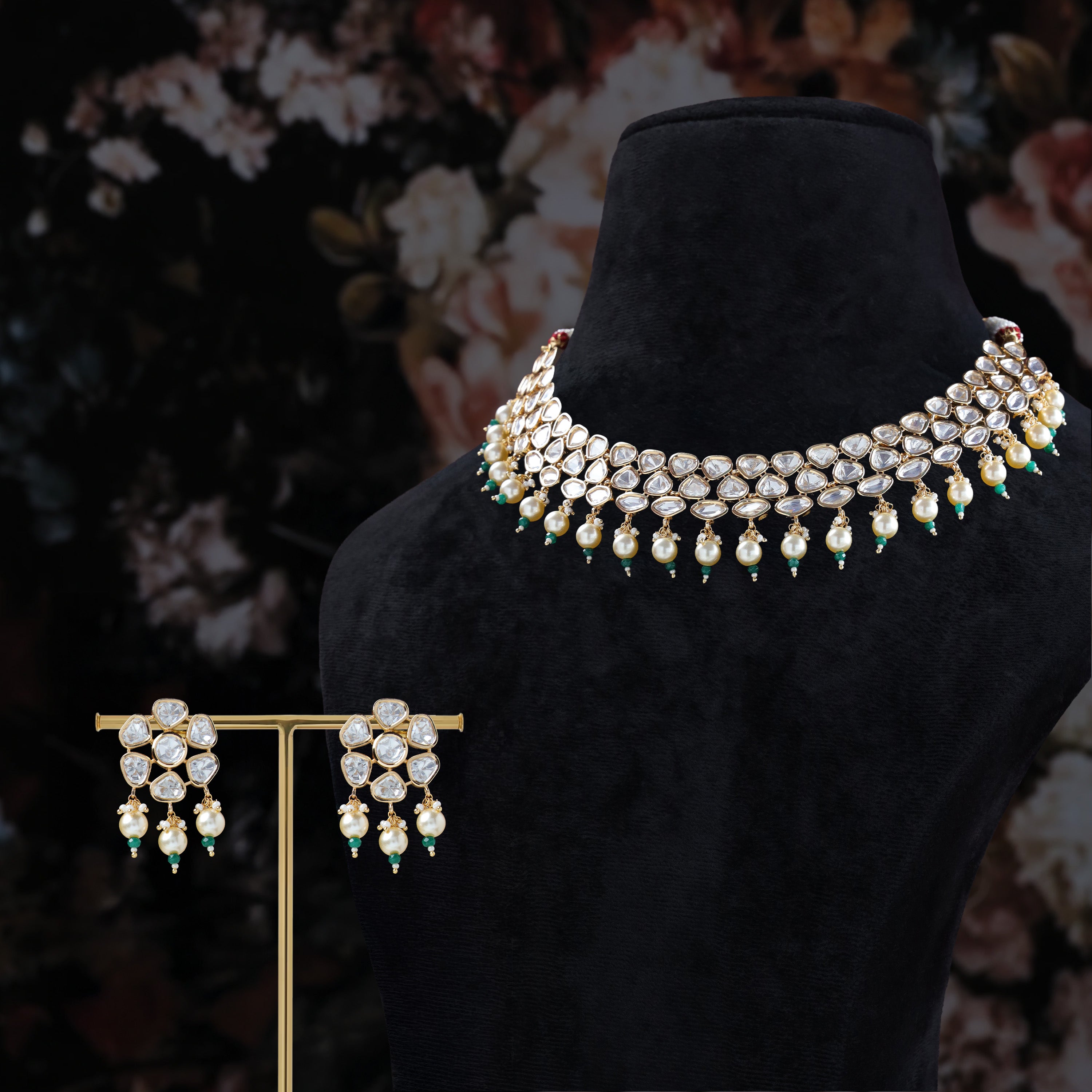 Radiate sophistication with the Amira Kundan Necklace Set, a luxurious blend of heritage and modern allure. Handcrafted with precision, this gold-plated set features an elegant kundan-studded choker and matching earrings, adorned with pearls and delicate green bead accents. A timeless piece perfect for weddings, festive gatherings, and grand celebrations.