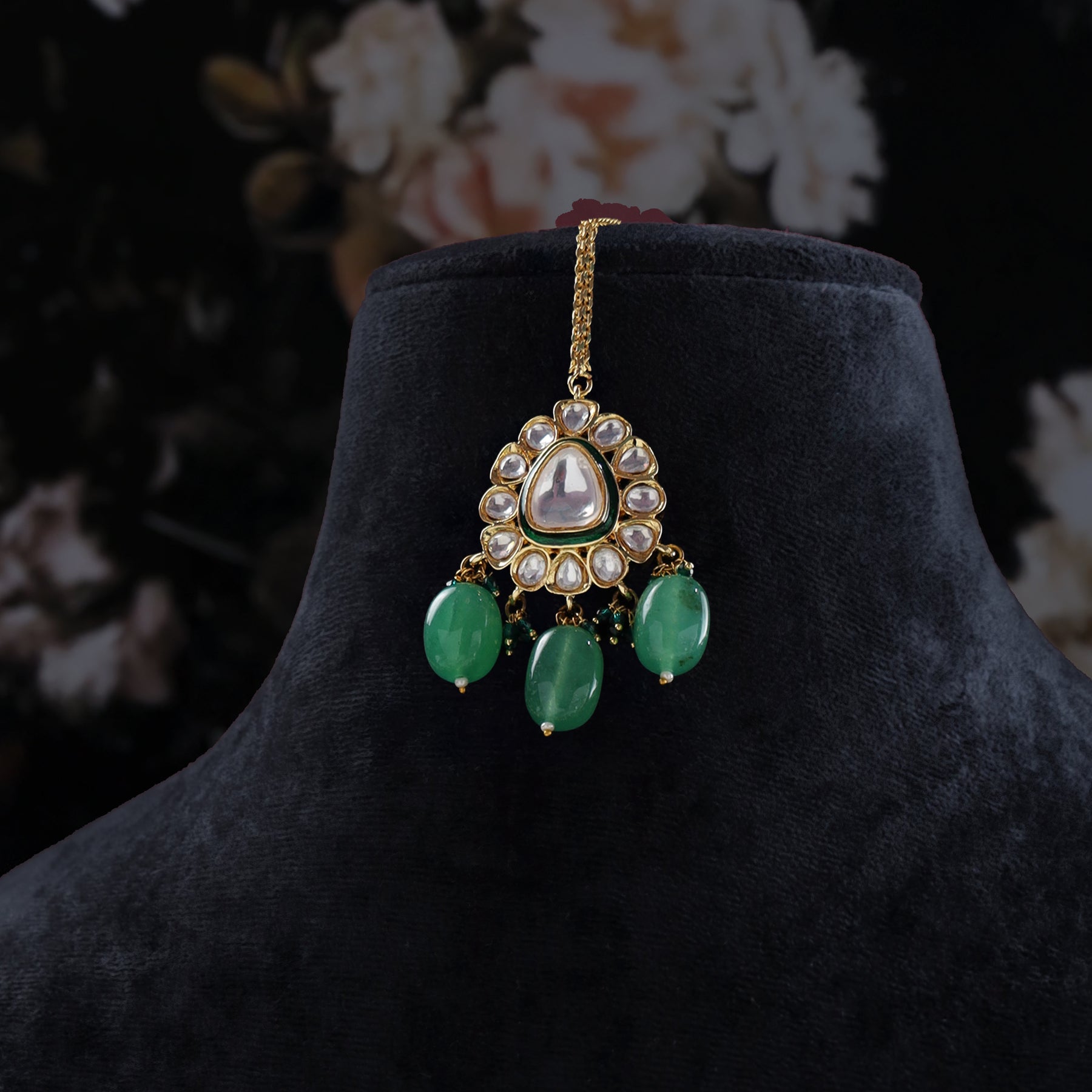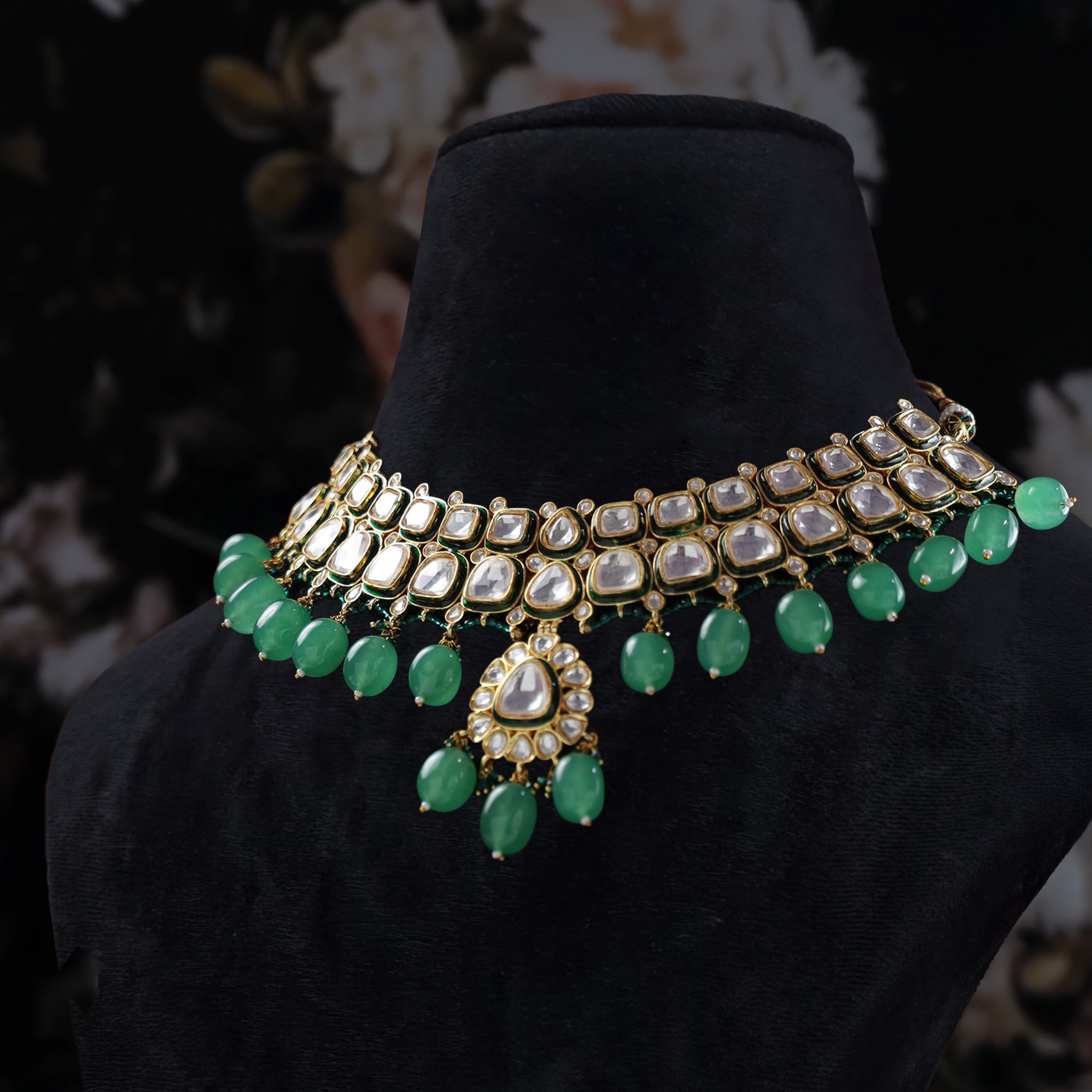 Bring heritage artistry to life with the Eshira Emerald Kundan Necklace Set. This regal choker design features dazzling kundan stones bordered with green meenakari and finished with bold emerald drop accents. The central pendant balances symmetry with brilliance, making it a showstopper piece. Paired with designer earrings and a maang tikka, it’s perfect for weddings, grand festivities, and royal bridal looks.