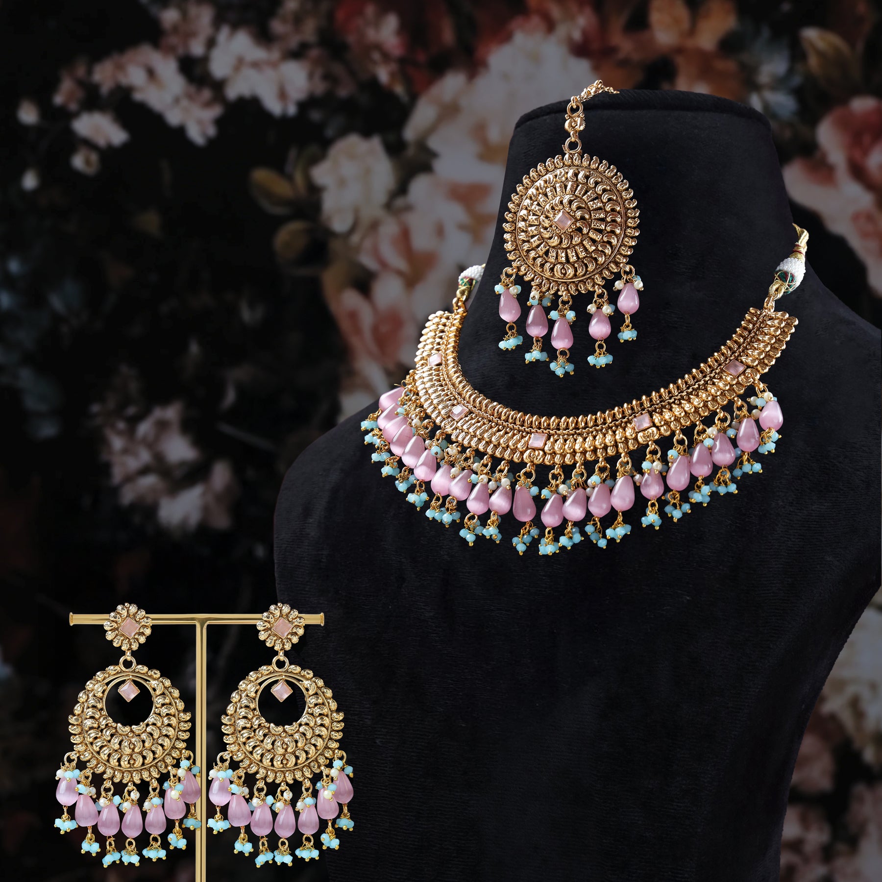 Bring softness and sophistication to your festive look with the Gulbahaar Necklace Set, a perfect balance of tradition and modern charm. Featuring a gold-plated finish that radiates timeless elegance, the set is adorned with pastel pink teardrop beads that add a feminine touch, paired with sky-blue bead detailing for a subtle yet striking contrast. The necklace showcases intricate circular motifs, giving it a refined ethnic appeal. Complete with matching earrings and a maang tikka, this lightweight set ensures comfort while elevating your bridal, festive, or party ensembles.