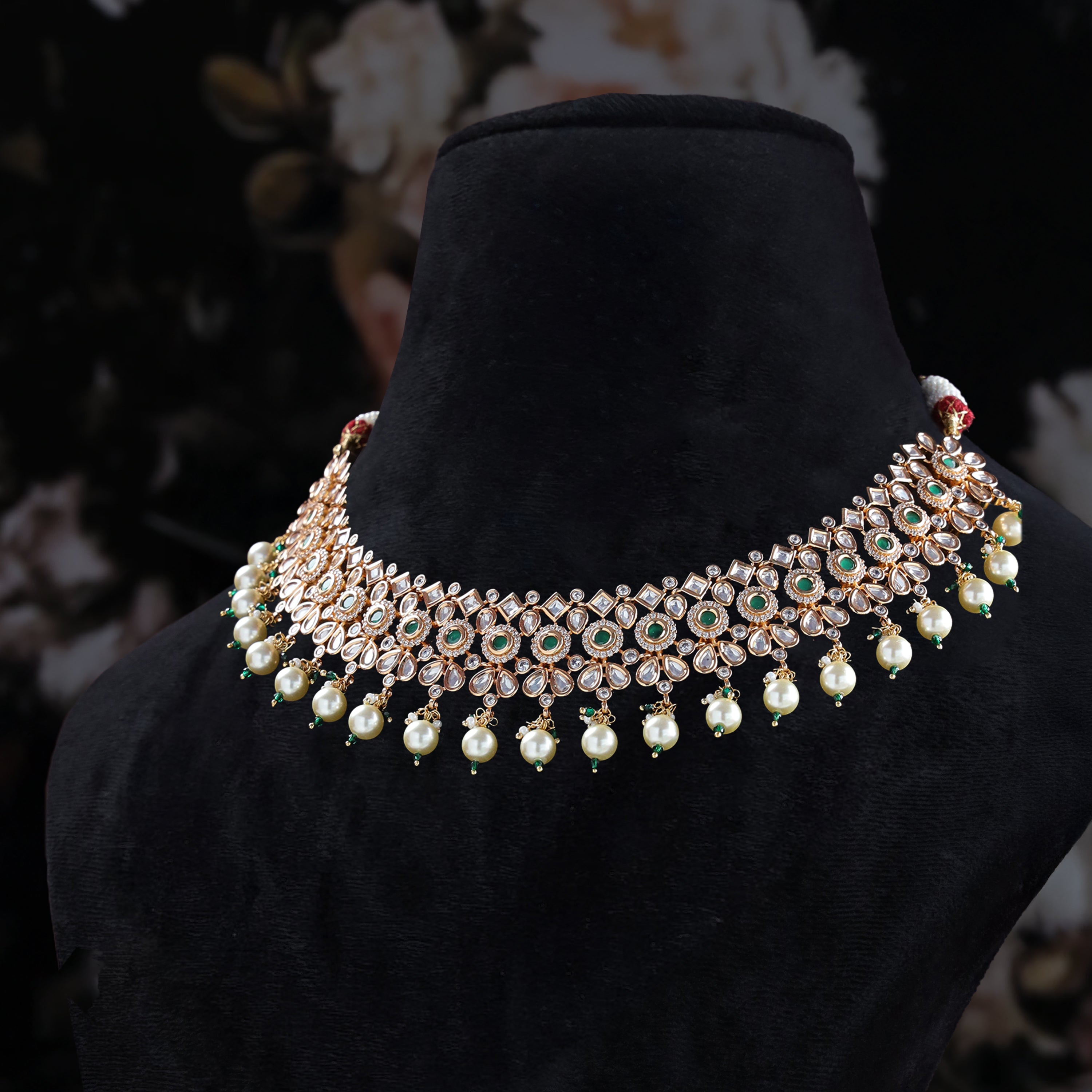 Turn every occasion into a royal celebration with the Kyara Kundan Necklace Set, a gold-plated masterpiece of heritage craftsmanship. Designed with intricate kundan work, green stone accents, and lustrous pearl drops, this set includes a stunning choker-style necklace and matching jhumka earrings — perfect for brides, festive gatherings, and traditional celebrations.
