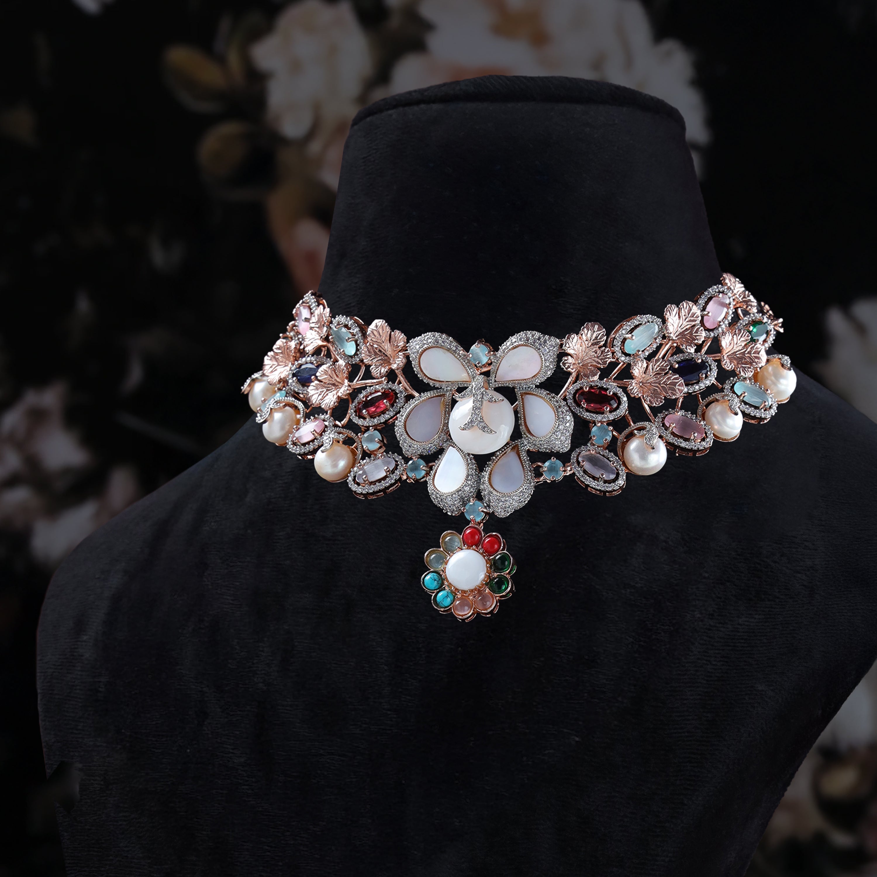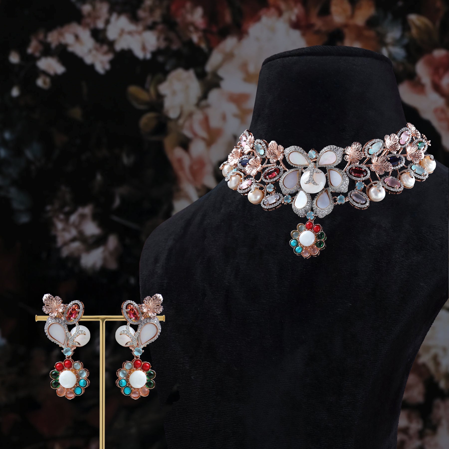 The Navya Floral Gemstone Necklace Set is a statement of timeless beauty and vibrant charm. With a gleaming gold base, luminous mother-of-pearl petals, and multicolor gemstones, it brings heritage-inspired elegance to every occasion. The refined pearl accents and intricate craftsmanship make this set a perfect match for bridal attire, festive ensembles, or glamorous evenings.