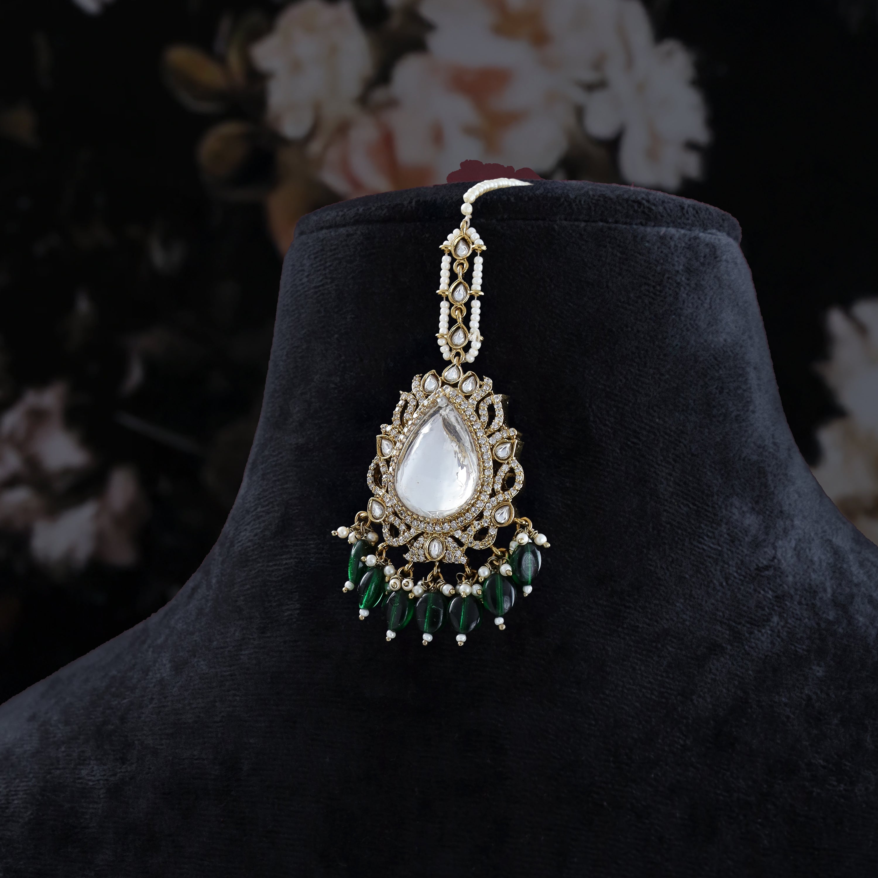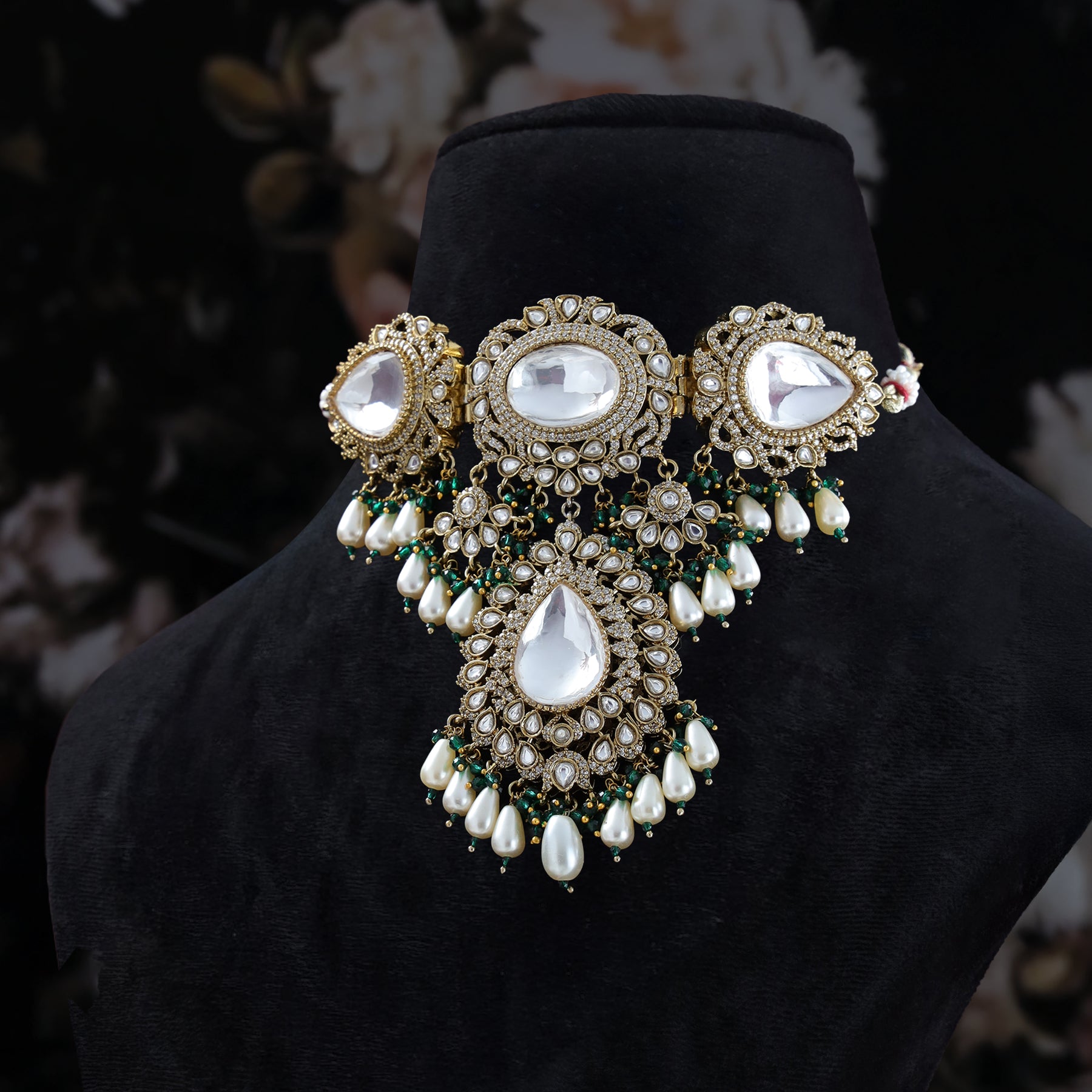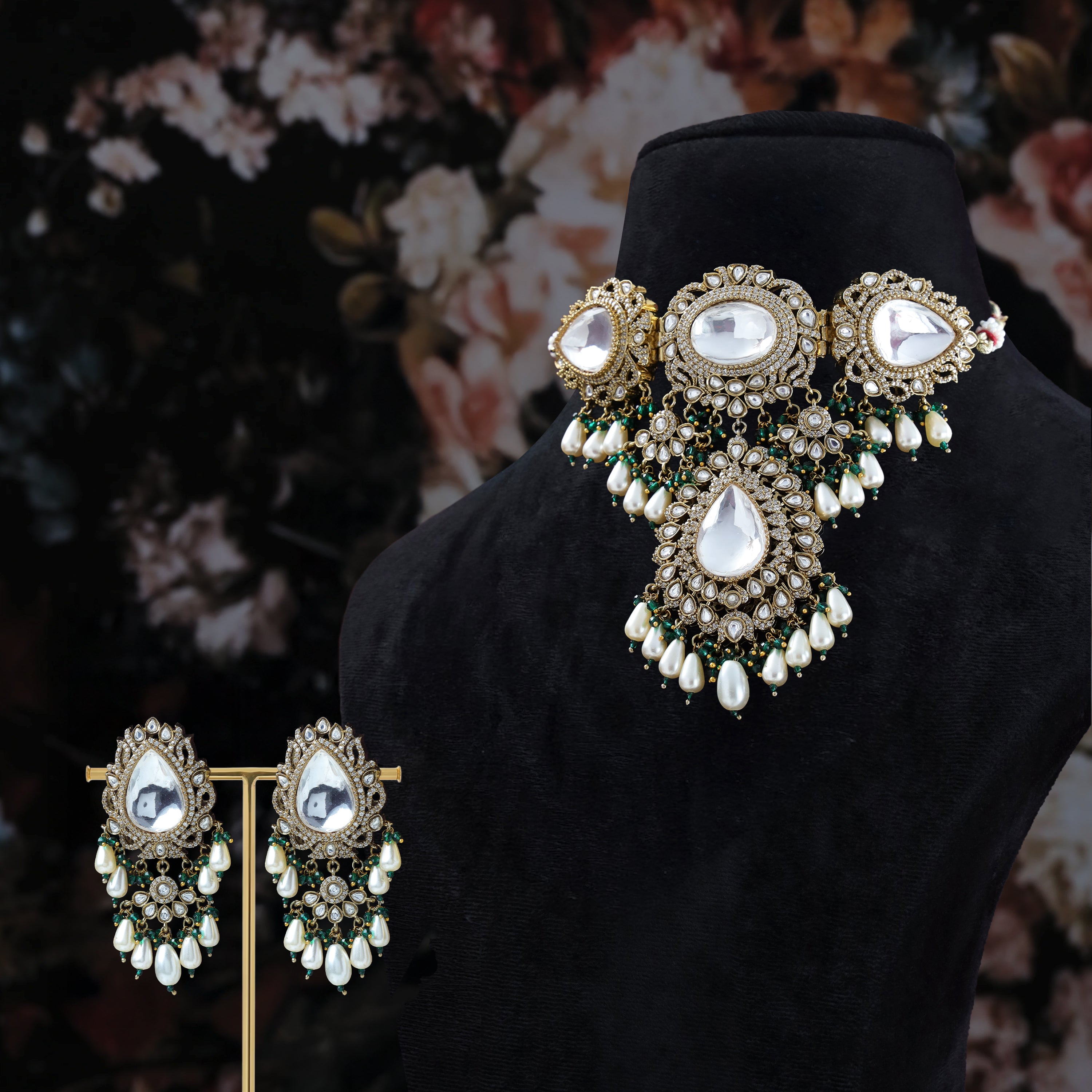 The Noor-E-Jahan Kundan Necklace Set embodies royal sophistication and bridal elegance. Featuring a handcrafted kundan choker enriched with pearls and emerald green beads, this set blends tradition with timeless luxury. Complete with matching earrings and a maang tikka, it’s the perfect choice for weddings, receptions, and grand celebrations.
