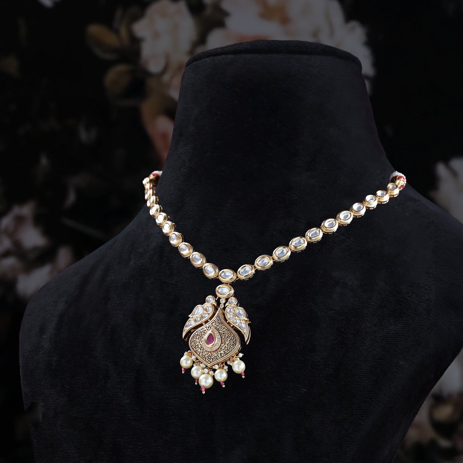 Radiate festive elegance with the Oorja Kundan Necklace Set, a gold-plated treasure designed to enhance your ethnic charm. This set features a graceful necklace with a statement pendant and matching jhumka-style earrings, beautifully adorned with kundan stones, pearls, and ruby-red accents. Perfect for weddings, festive occasions, and traditional gatherings.