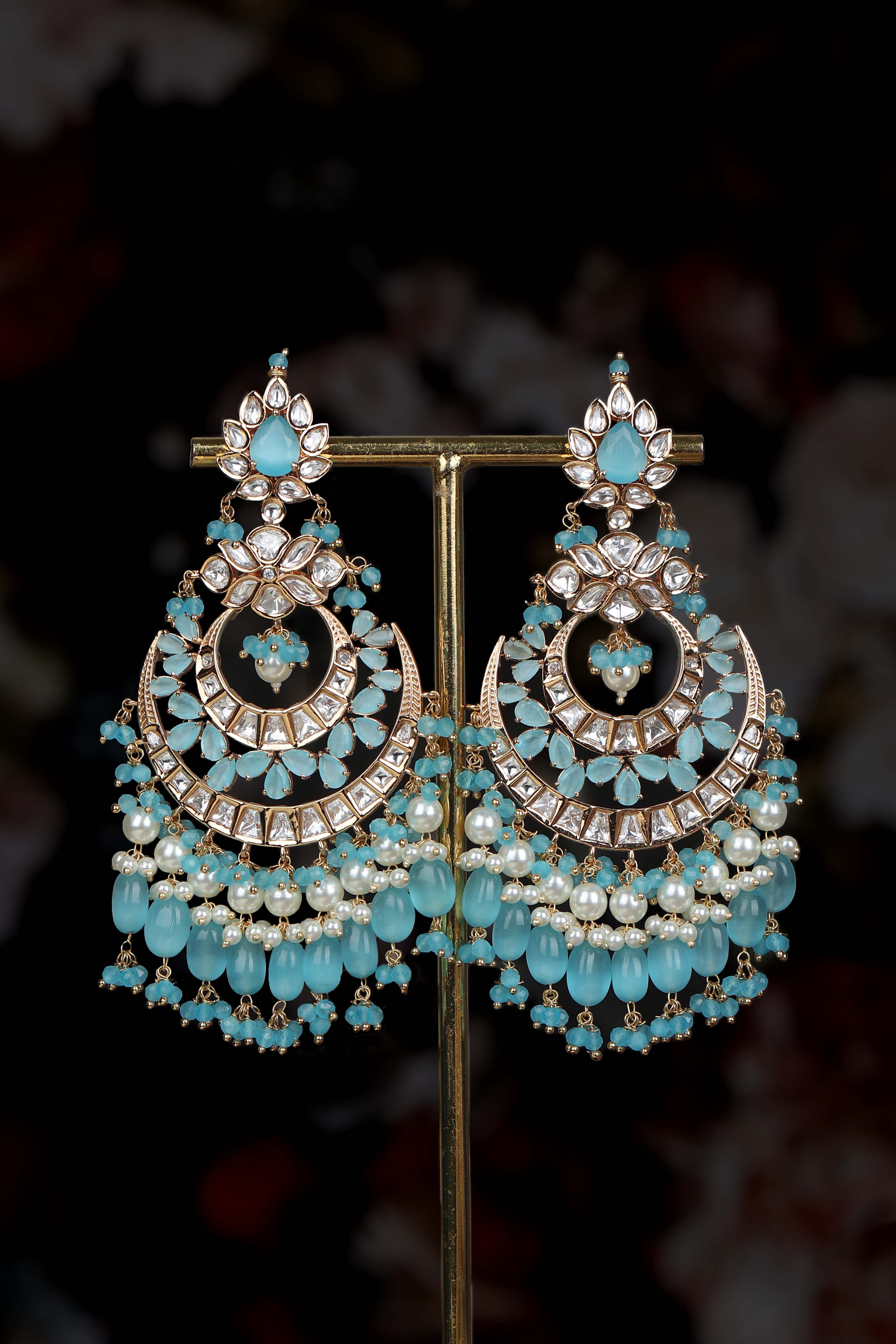 Crafted with opulence in mind, these earrings elevate your charm effortlessly, regardless of the occasion. Fashioned from high-quality stones and featuring a unique design, they exude sophistication. Complete with dangling sky-blue beads, this pair promises to bestow upon you the DIVA-like allure you desire.