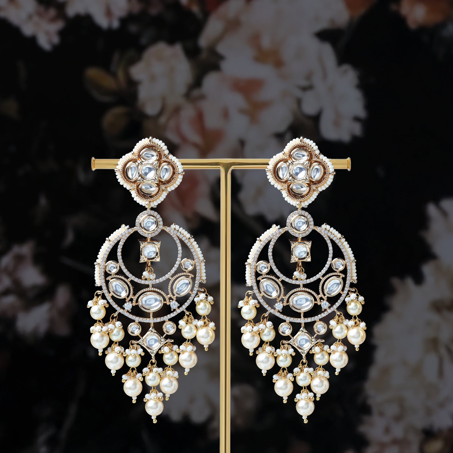 The Ratnavali Kundan Choker Set brings together tradition and grandeur in one stunning design. Featuring rows of polki-style stones, delicate pearl fringe borders, and a bold symmetrical motif layout, the choker captures royal elegance. The matching chandelier earrings and large maang tikka echo the same artistry with polki stones and pearl drops, making this set a complete choice for brides and festive occasions.