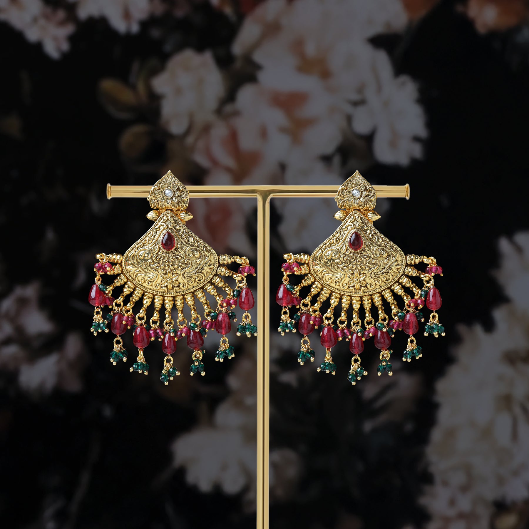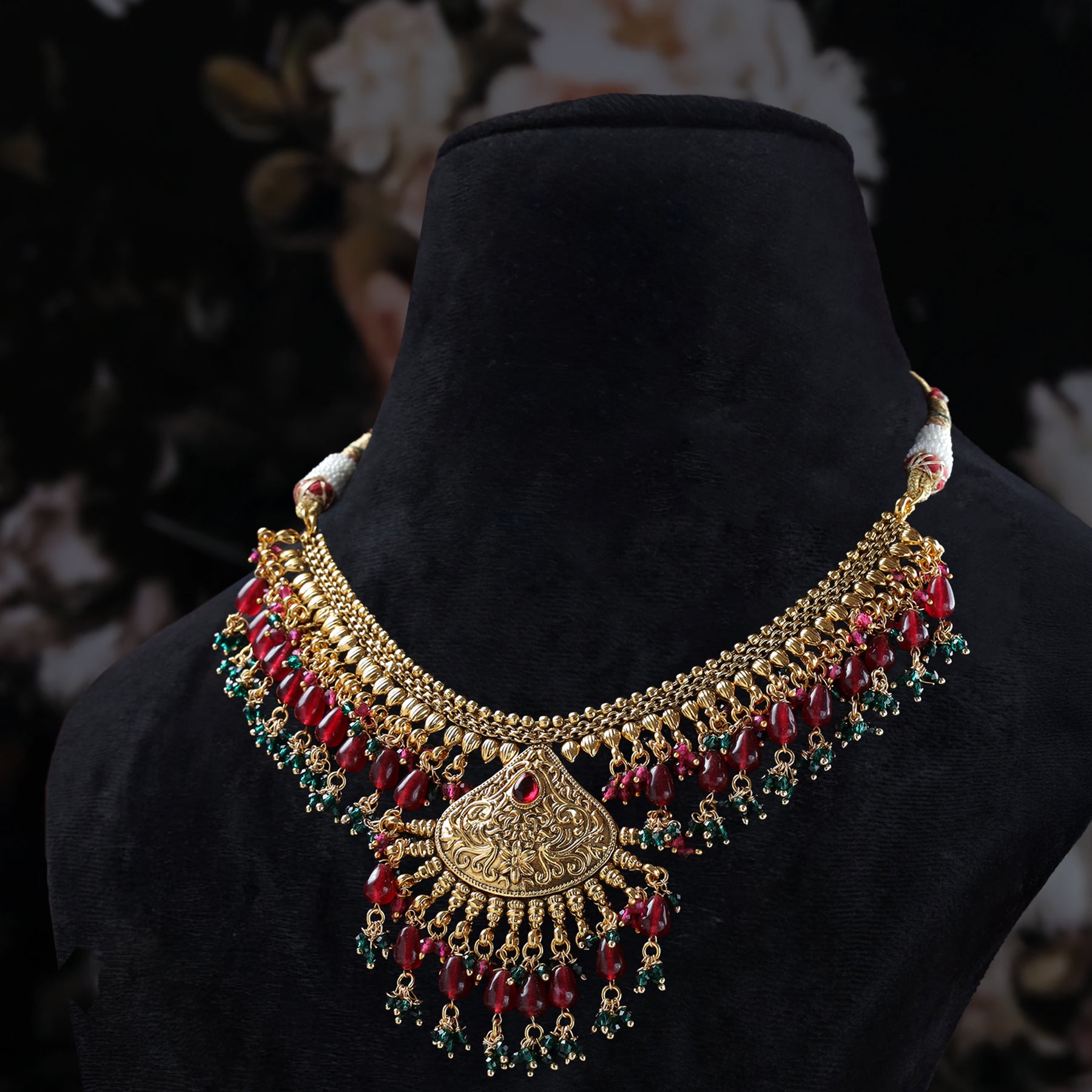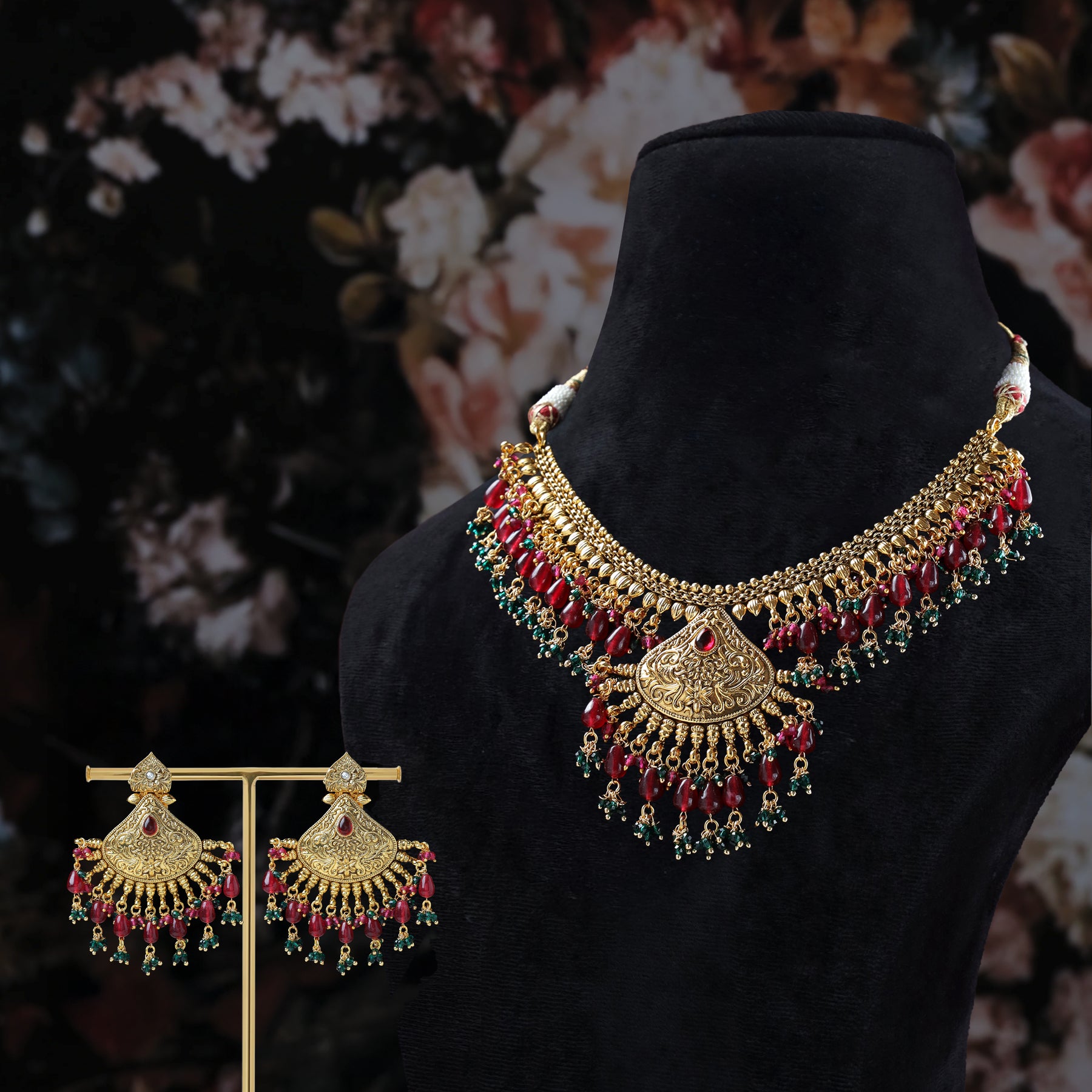 The Rudhra Temple Glow Set is an ode to timeless heritage and spiritual artistry. Crafted in a temple-style design with a radiant gold-plated finish, it features ruby red embellishments balanced with emerald bead accents for a striking contrast. Paired with matching earrings and a maang tikka, this set is perfect for brides and festive celebrations where tradition meets elegance.