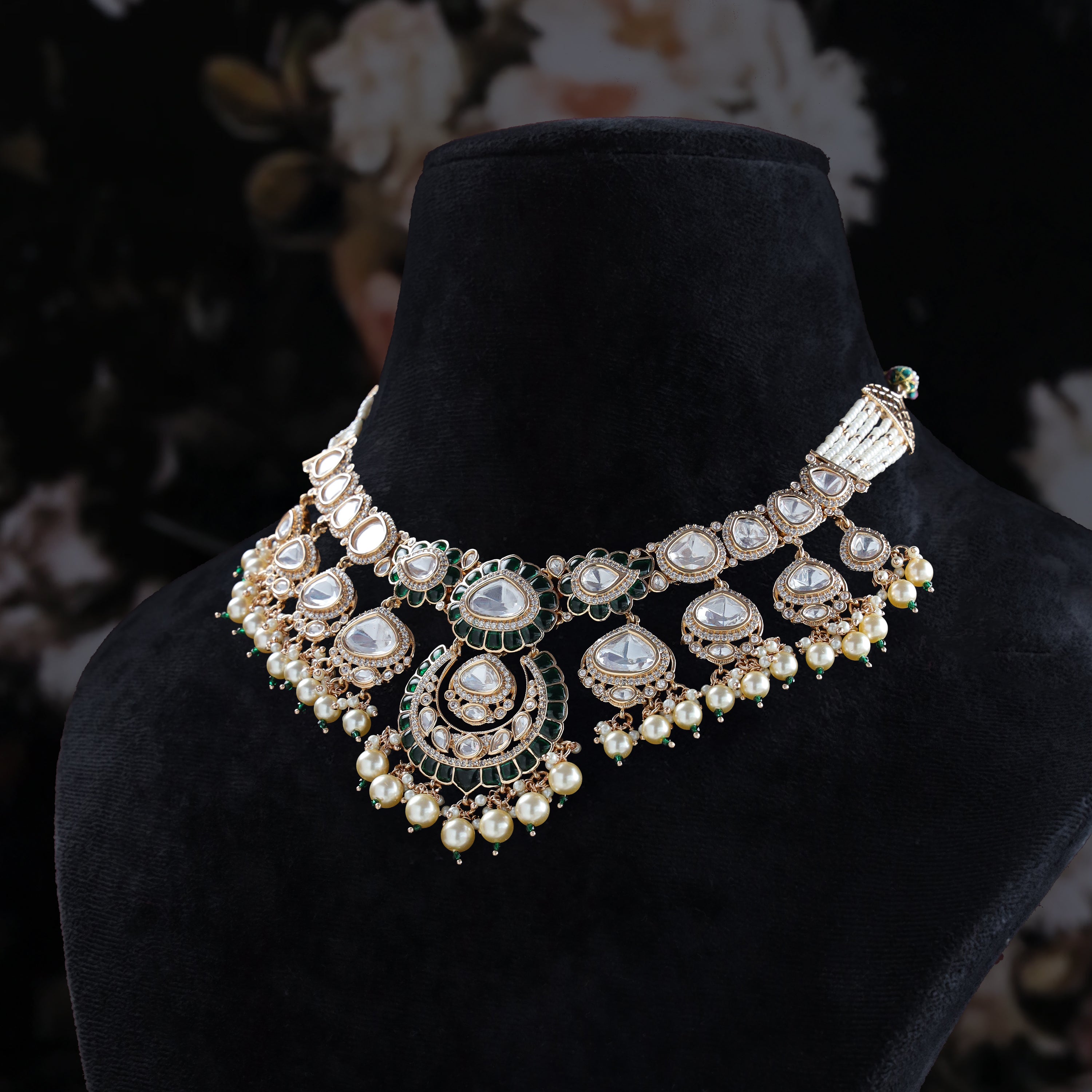 The Ruhani Kundan Set is a celebration of traditional grandeur and modern sophistication. With its intricate kundan work, gold-plated finish, and pearl detailing, this set captures the essence of timeless royal jewelry. Perfect for weddings, engagements, and festive occasions, it promises to make you the center of attention.