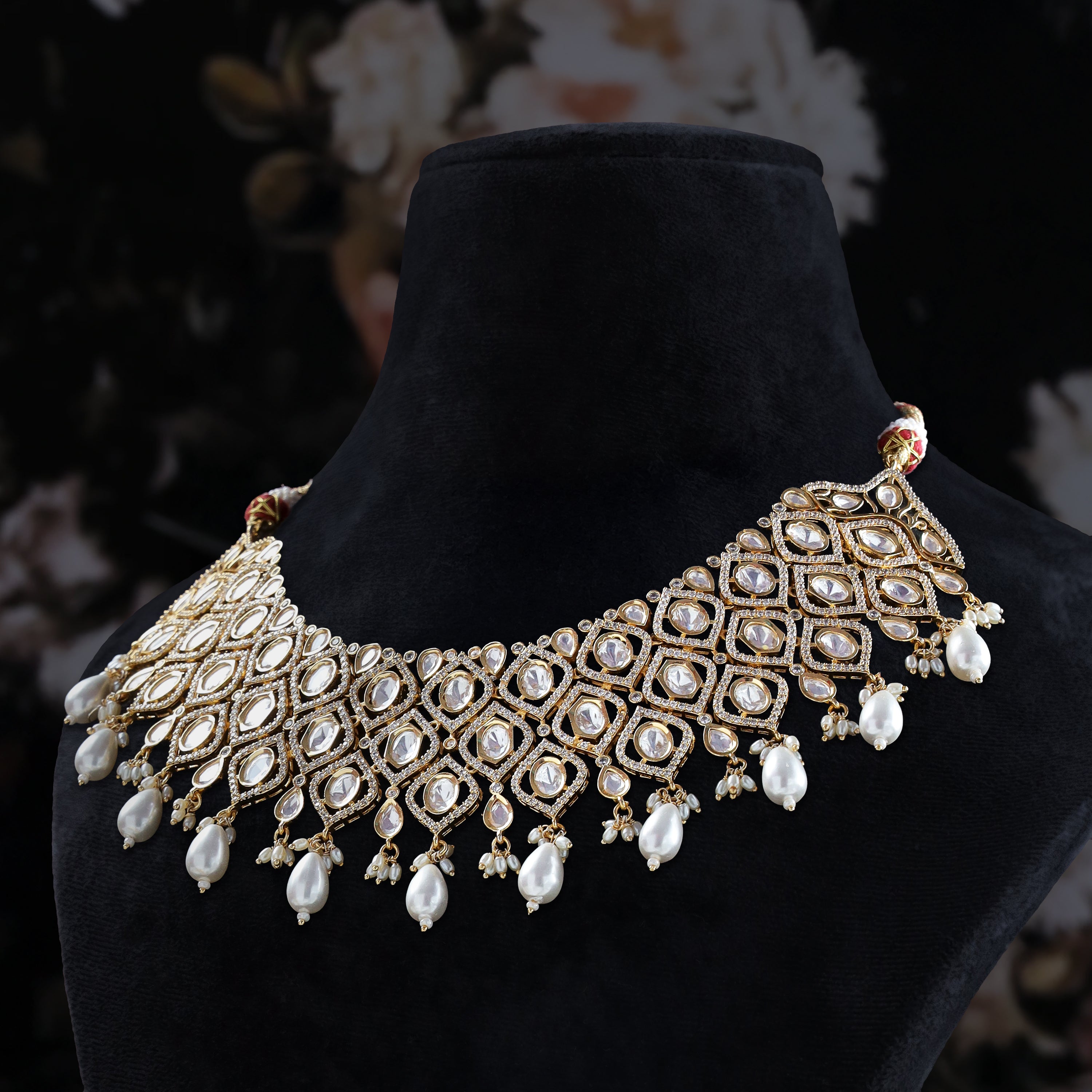 Embrace royal elegance with the Sharvya Kundan Necklace Set, a handcrafted masterpiece plated in radiant gold. Designed with intricate kundan work and adorned with lustrous pearls, this set features a statement choker-style necklace and matching earrings — perfect for weddings, festive functions, and grand celebrations.