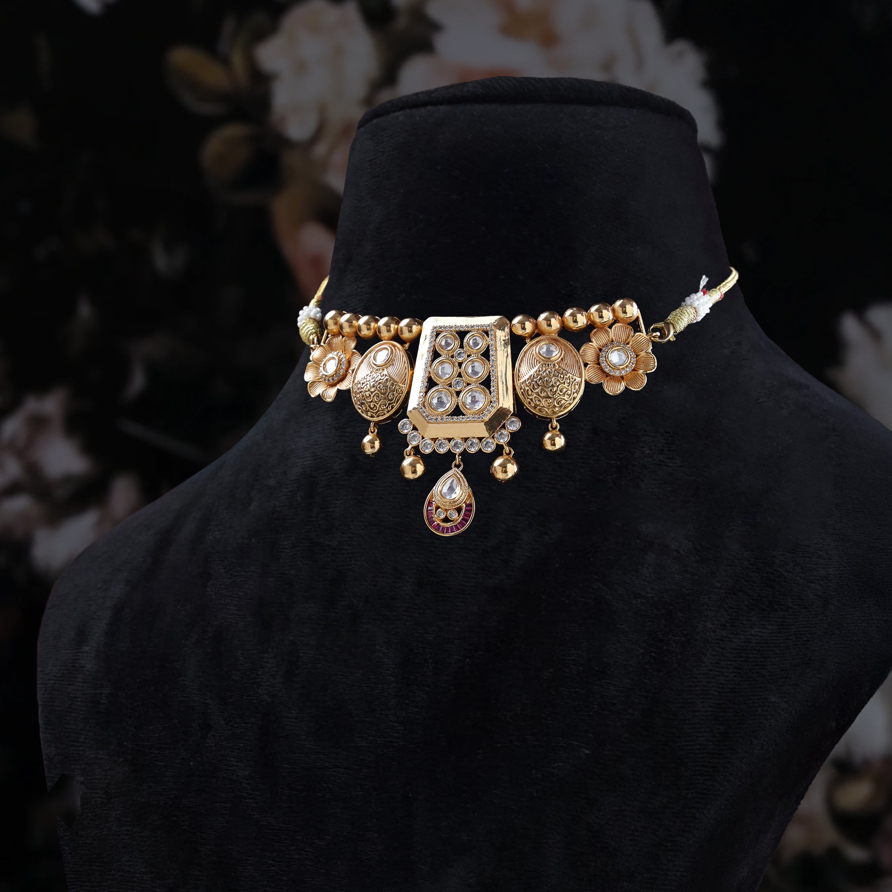 The Suvarnangi Choker Necklace Set is a statement of heritage beauty and festive charm. Designed with a gold-plated temple-inspired finish, it features floral detailing, ruby red and white stones, and refined bead accents for a royal look. Complete with matching floral-top dome earrings, this adjustable choker ensures comfort while adding a touch of regal tradition to your bridal or festive attire.