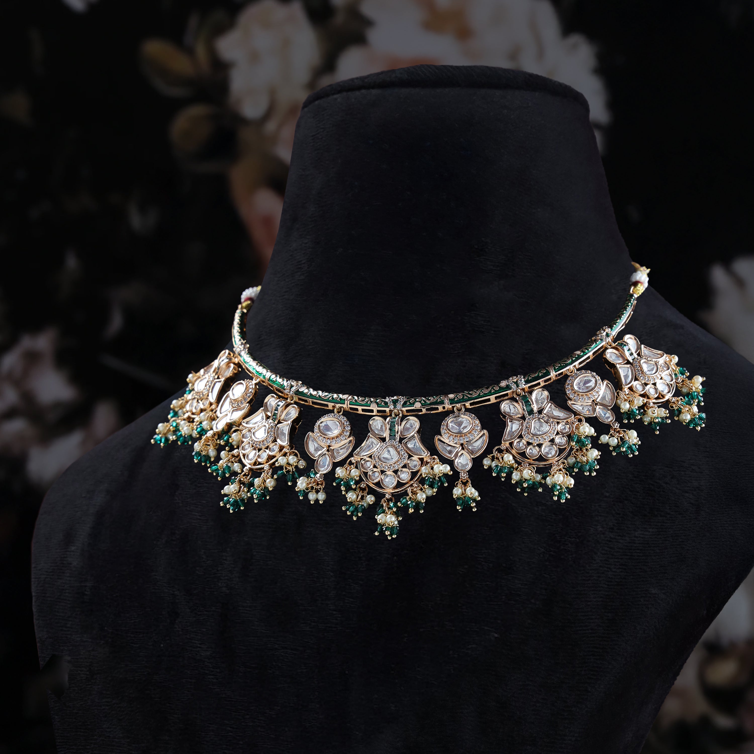Celebrate timeless beauty with the Tavisha Kundan Necklace Set, a handcrafted gold-plated treasure designed to radiate grace. Featuring a choker-style necklace, elegant earrings, and a stunning maang tikka, this set is adorned with kundan stones, pearls, and green bead accents — making it perfect for bridal looks, weddings, and festive occasions.