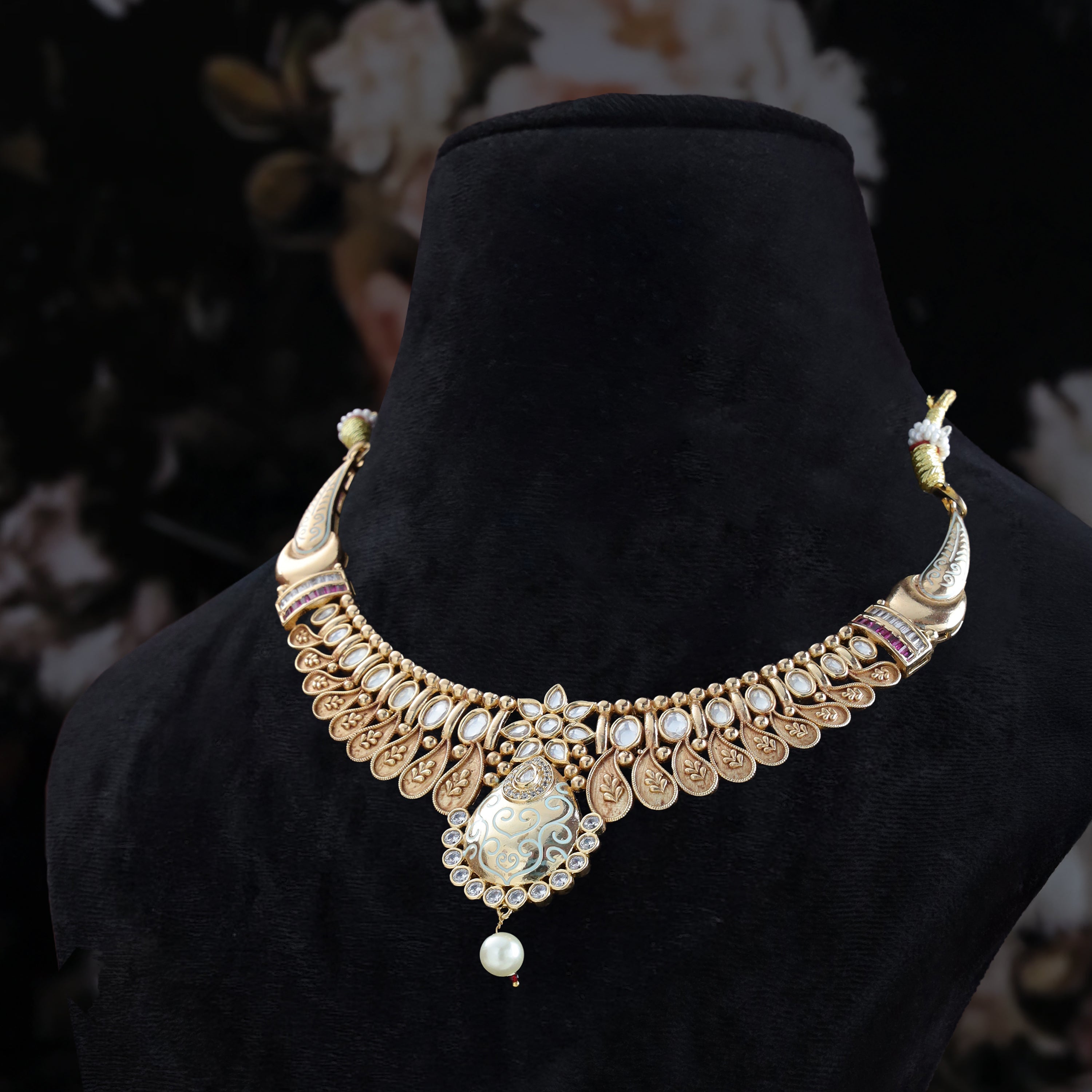 Bring home the charm of timeless artistry with the Vanshika Antique Kundan Set. This regal gold-plated set features an intricately designed necklace embellished with kundan stones, antique motifs, and a striking central pendant adorned with pearls and crystal highlights. Paired with traditional jhumka earrings featuring floral kundan tops and pearl drops, this set adds an exquisite touch of vintage elegance to your bridal and festive attire.