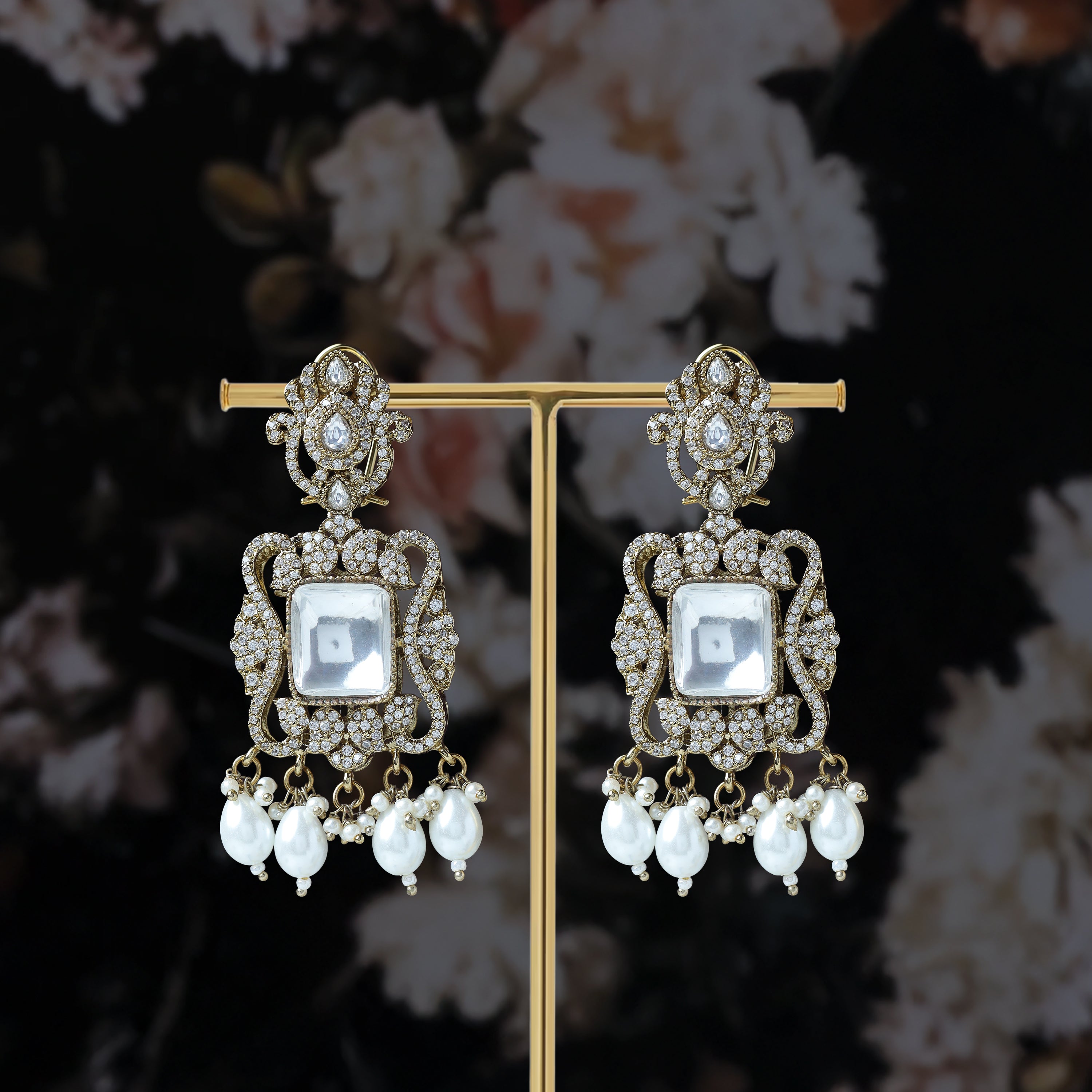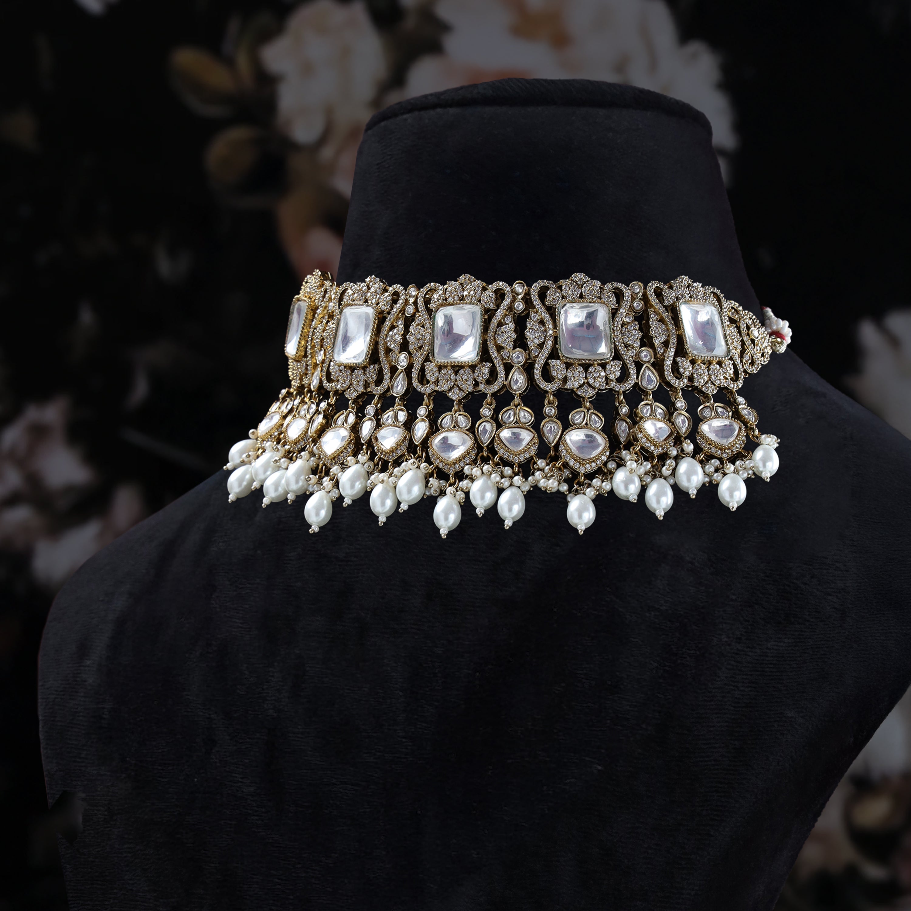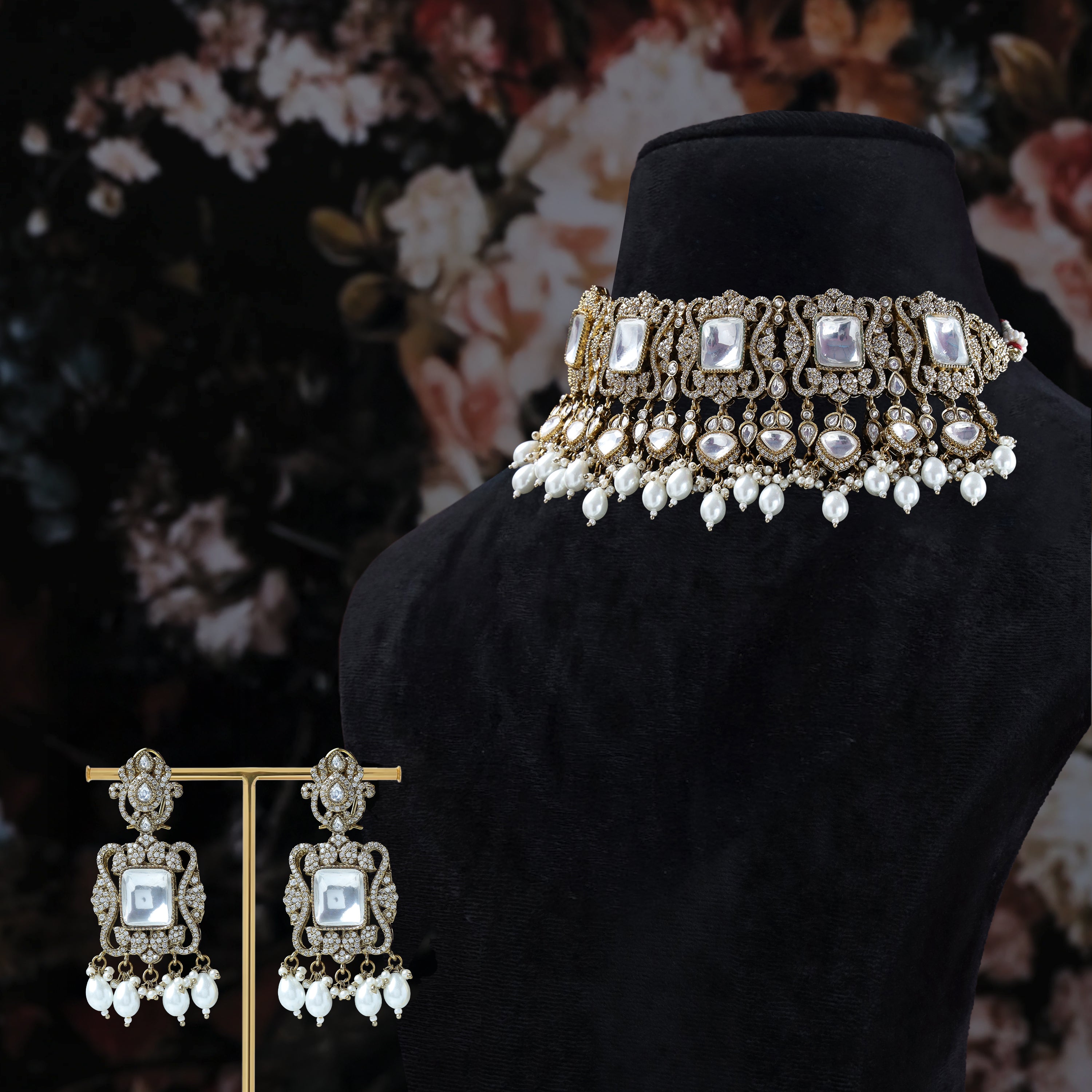 The Zarqa Kundan Choker Set is a tribute to royal heritage and timeless artistry. Its gold-plated choker shines with square polki-style kundan stones, framed by delicate filigree and shimmering micro zircons. The soft pearl drops add a graceful finish, making the design move beautifully with every step. Complete with chandelier-style earrings, this set is perfect for brides and festive occasions, bringing Mughal elegance to your modern celebrations.
