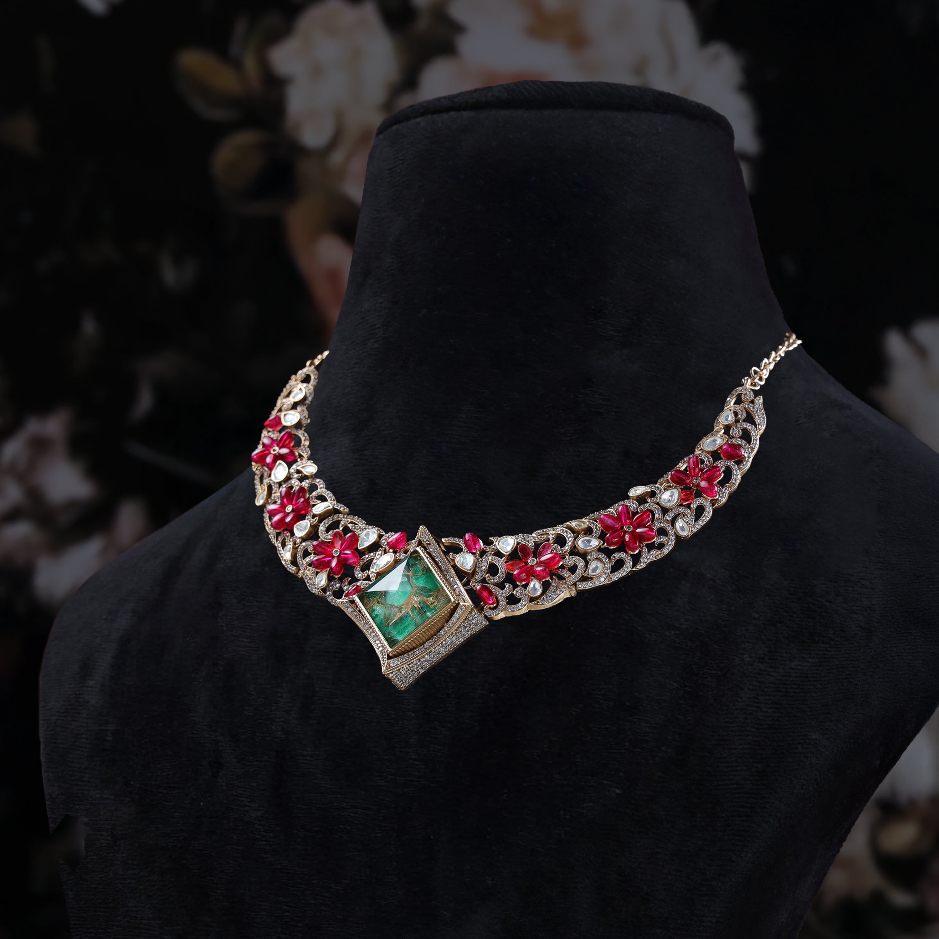 The Zyra Ruby-Emerald Necklace Set captures the essence of heritage beauty. Crafted with a lustrous gold-plated base, it features kundan stonework, a bold emerald centerpiece, and delicate ruby floral detailing that reflects royal elegance. The set comes with coordinated earrings, making it a versatile choice for bridal, festive, and evening occasions.